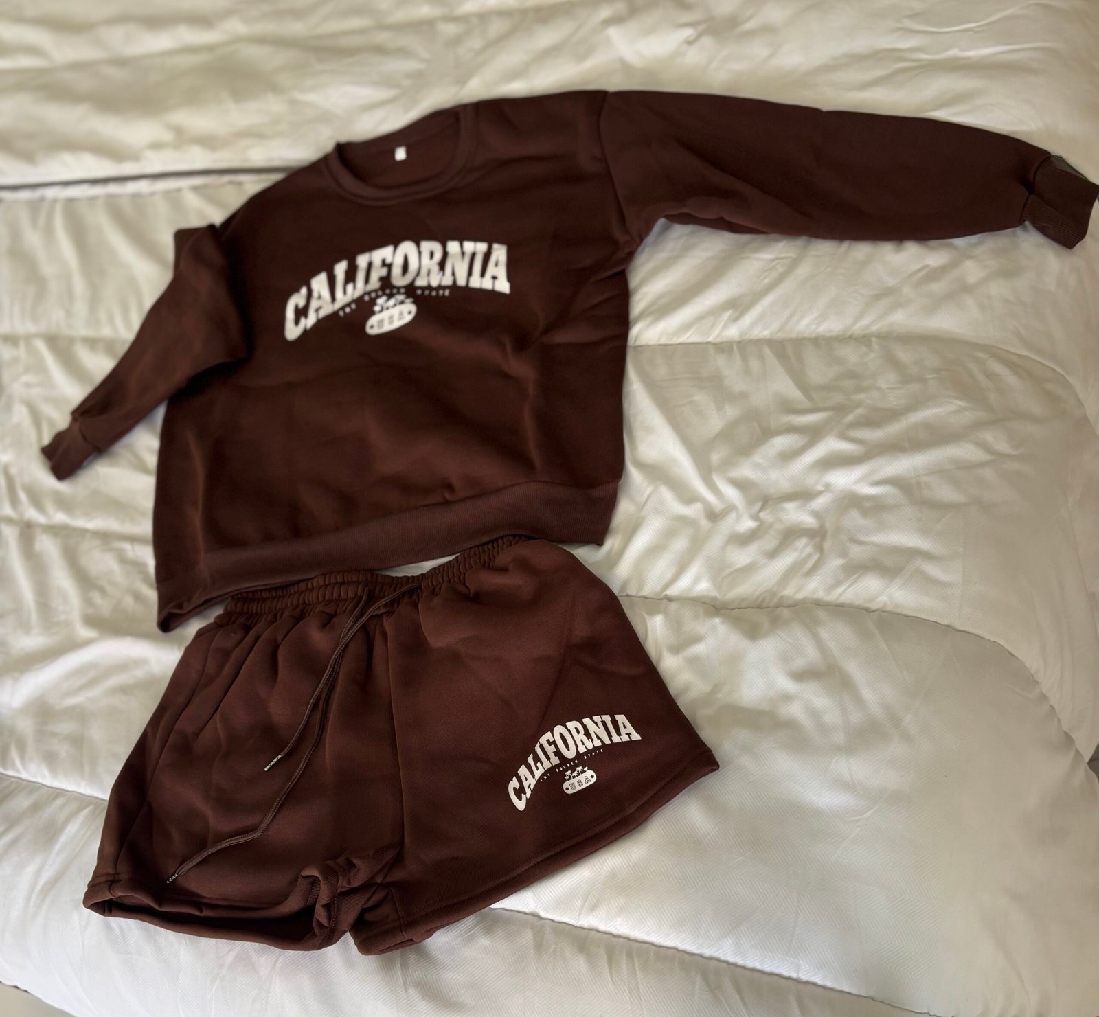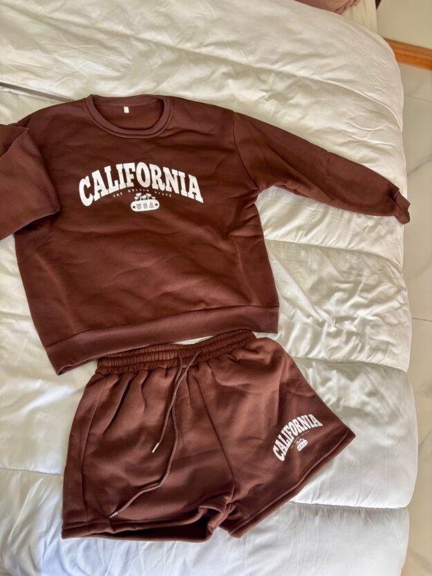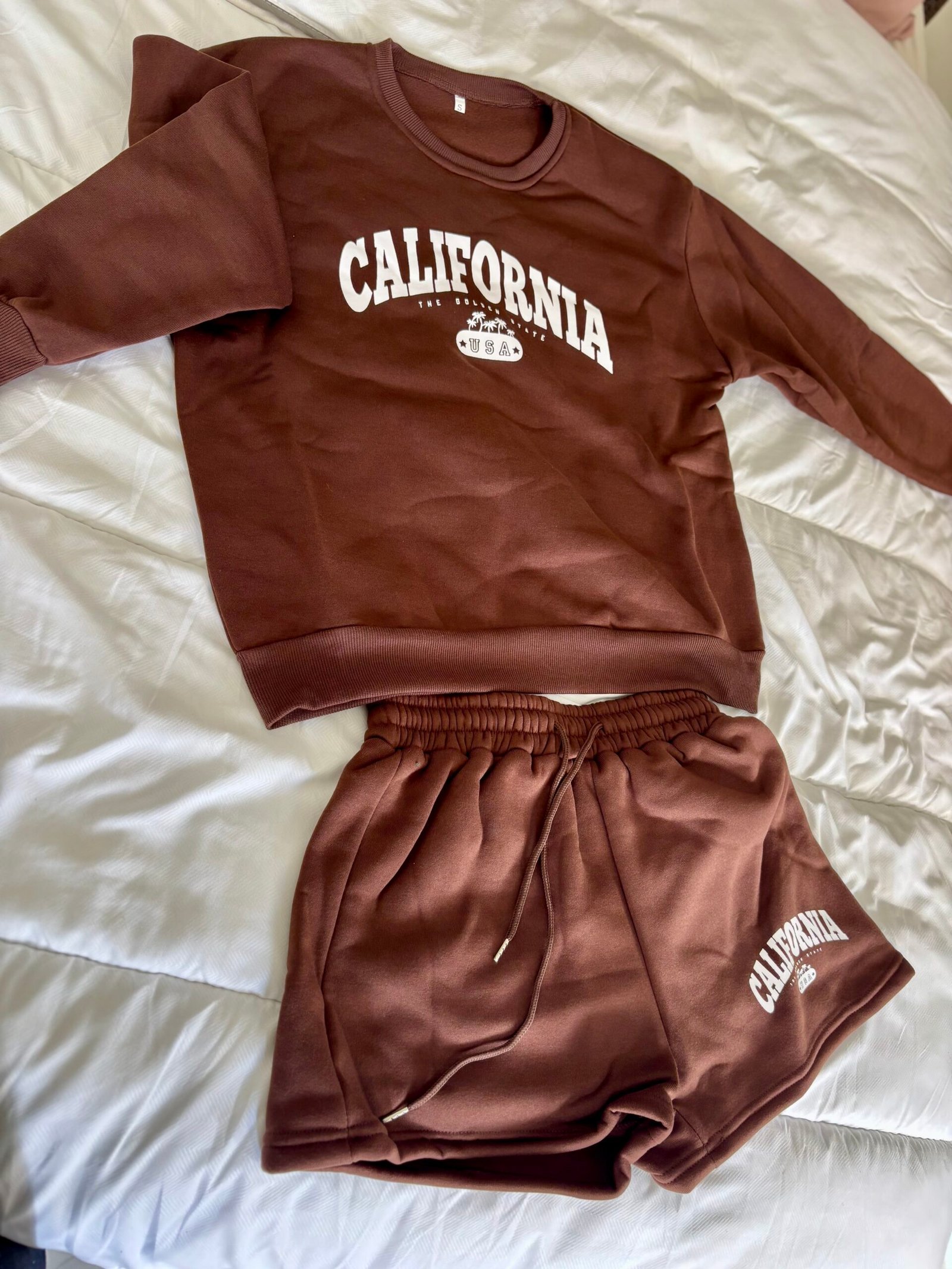 Ensemble deux pièces composé d’un pull à manches longues et un short assorti CALIFORNIA dans une teinte marron.